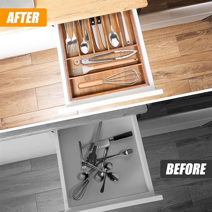 - ✅【Perfect premium bamboo】Our utensil silverware drawer organizer flatware cutlery tray is crafted from natural bamboo that has been grown for over 4 years. Each silverware drawer organizer made of bamboo is meticulously handcrafted by seasoned artisans to ensure a smooth, splinter-free surface. You can confidently allow your family or children to use our silverware drawer organizer. Unlike plastic and metal drawer organizers, our utensil holder is water-resistant and odor-resistant, making it perfect for long-term use.