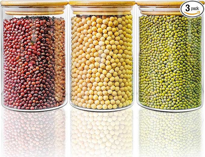 - [ Premium Glass Storage Containers with Lids Set of 3 ]: Premium glass jars with bamboo lids set have 3 pack 45 floz glass jars, and the size is 4.0 x 7.9 inch, great for pasta, coffee, oats, cereal, flour, sugar, rice, candy, cookies, nuts, teas, etc.The 45 oz glass jars with airtight lids are perfect to store food for maximum freshness and convenience in cabinet and pantry. With 4" wide mouth design, which can easily take out and refill with any type of foods