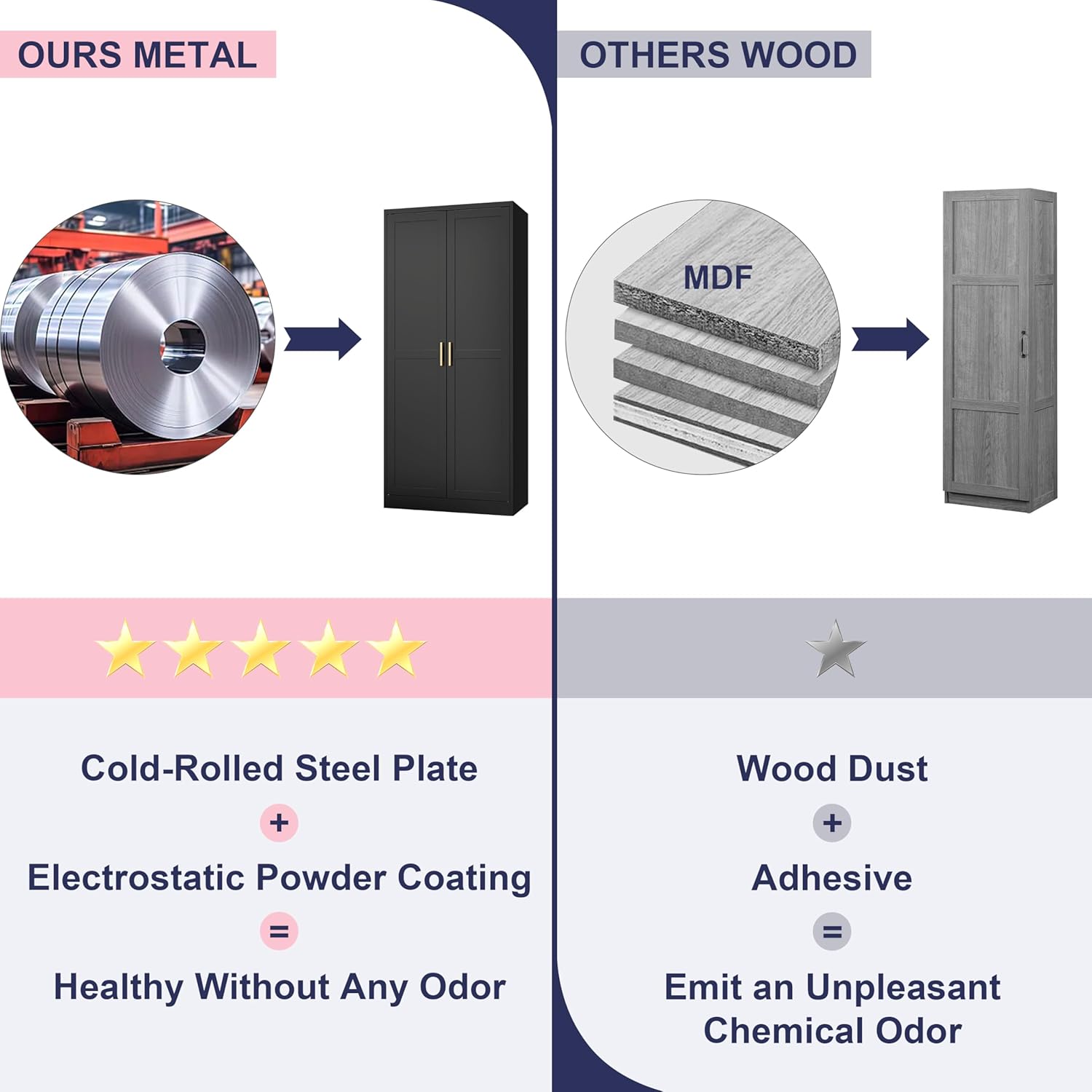 71" Storage Cabinet, Metal Pantry Cabinet, Kitchen Pantry Storage Cabinets with Doors and 4 Shelves for Laundry Room, Living Room, Dinning Room, Assembly Required, Black