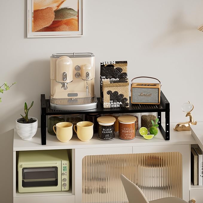 - ⭐【Flexible retractable design (Expandable & Adjustable)】This kitchen shelf uses a retractable design, which can be freely adjusted according to the size of the kitchen space and personal needs. Whether it is a narrow corner or a spacious storage room, it can be easily adapted to make the most of every inch of space.(10.1"D x 16.54"W~26.38"W x 6.22"H)