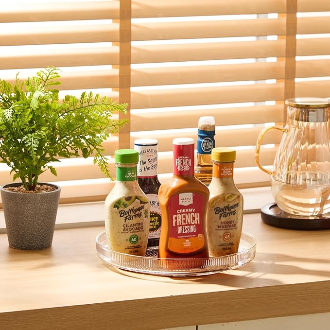 - MULTIPURPOSE ORGANIZER: This versatile Lazy Susan turntable is perfect for a variety of uses. Organize your spices, seasonings, snacks or even display items on a shelf. It also serves as a stylish cosmetics, perfumes holder or a bathroom organizer, keeping your desktop neat and tidy.