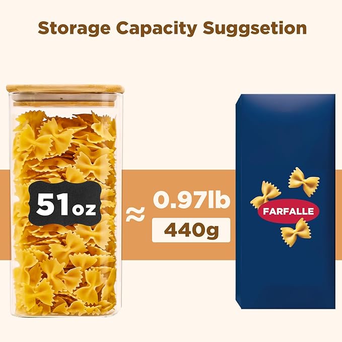 - [Premium quality and safety assurance] Our glass containers with bamboo lids are made of premium quality and borosilicate glass, glass pantry storage containers can withstand the harsh tests of daily use. The bamboo lid provides an airtight seal, ensuring the freshness of stored food. Our glass food storage jars are BPA Free, Phthalate Free, PVC Free, Lead Free, They are healthy and reliable choice for your kitchen.