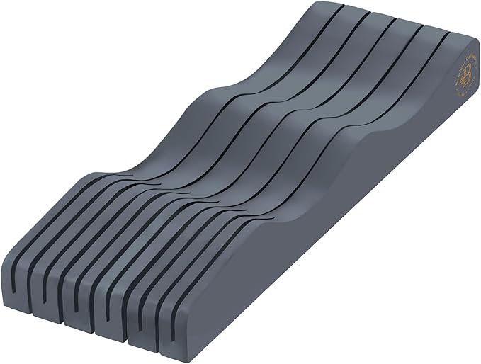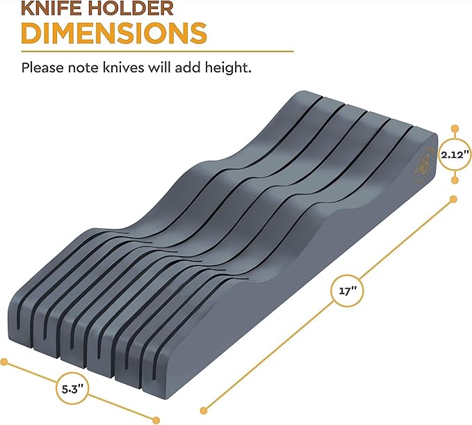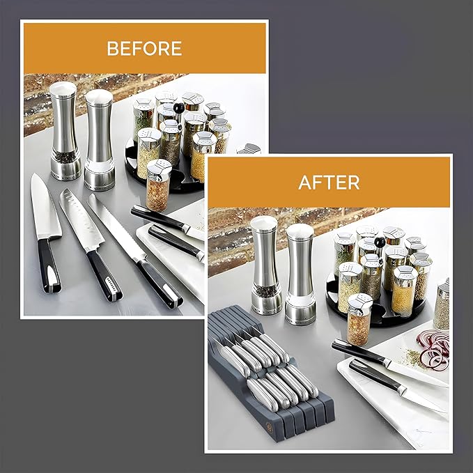 - IN DRAWER KNIFE ORGANIZER: No more keeping a clunky knife block out on your counter. (Measure your drawer and knife heights to see if it’ll fit for you.) The steak knife block fits a total of 5 large knives + 6 small ones, or 16 short knives.