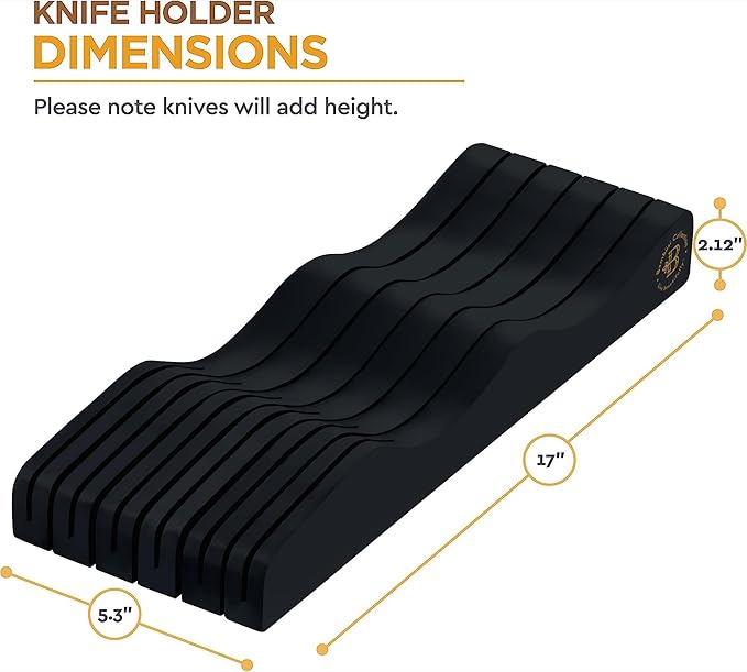 - IN DRAWER KNIFE ORGANIZER: No more keeping a clunky knife block out on your counter. (Measure your drawer and knife heights to see if it’ll fit for you.) The steak knife block fits a total of 5 large knives + 6 small ones, or 16 short knives.