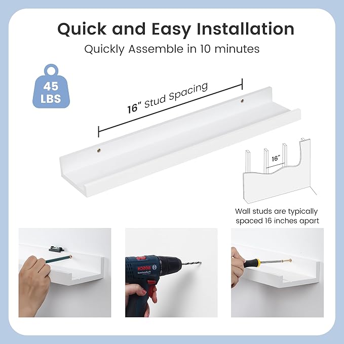 - Easy to Install: You will get a level, screws for the wall, drywall anchors, a detailed installation guide, and two beautiful hand-crafted solid pine wood shelves. With the level, you can make sure your picture ledge shelves are well aligned. Just follow the simple instruction to install the hanging shelves for wall decor within 10 minutes. We add additional screw and anchor to the hardware bag just in case. If you have any questions about our products, please feel free to contact us