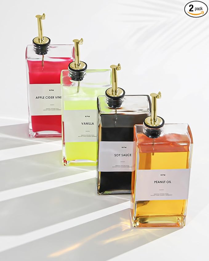 - [12OZ/350ML Large Capacity Oil Dispenser Set]: With elegant rectangular olive oil dispenser bottle set enhance your kitchen decor also very pragmatic. This set includes two high-quality 12 oz (350 ml) glass bottles, four gold pourers, a funnel, and 35 designed labels and 5 blank labels for your custom use.