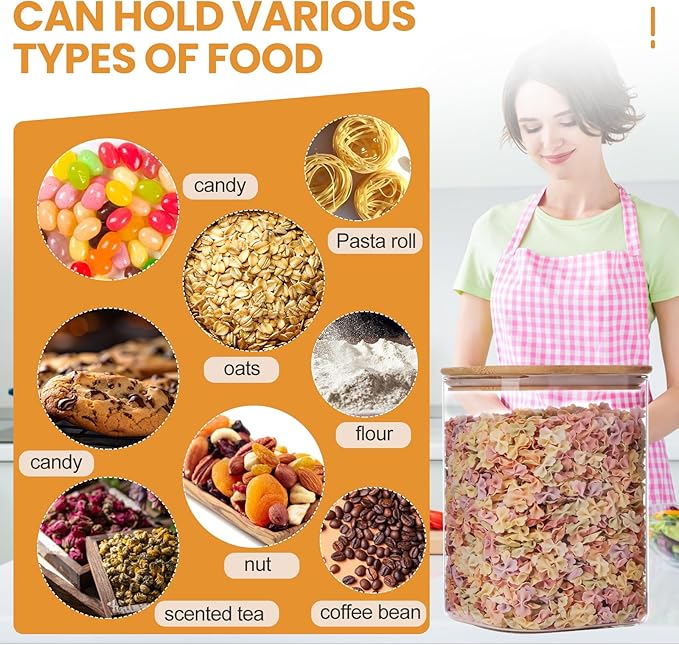 - Versatile Size and Set: This square glass jars is the perfect solution for storing a variety of items. From grains and pasta to nuts and spices, these jars offer ample space while maximizing shelf or cabinet space. Keep your kitchen neat and tidy while adding a touch of elegance