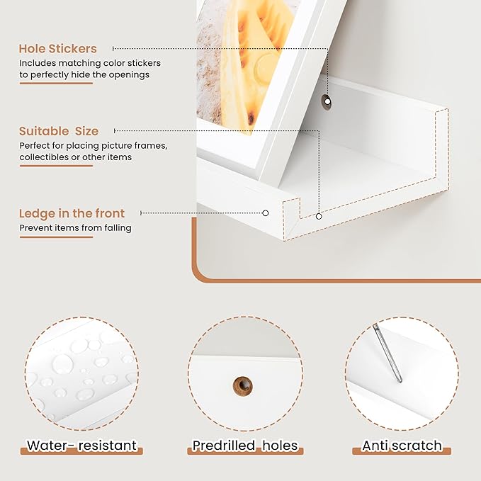 - Enhanced Stability Design: Featuring a secure lip at the front, these floating shelves prevent items from slipping or falling, confidently supporting up to 45 lbs, making these MDF wood shelves ideal for showcasing cherished items.