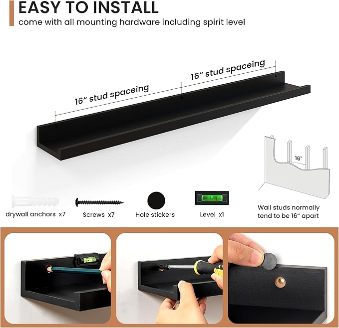 - Enhanced Stability Design: Featuring a secure lip at the front, these floating shelves prevent items from slipping or falling, confidently supporting up to 45 lbs, making these MDF wood shelves ideal for showcasing cherished items.