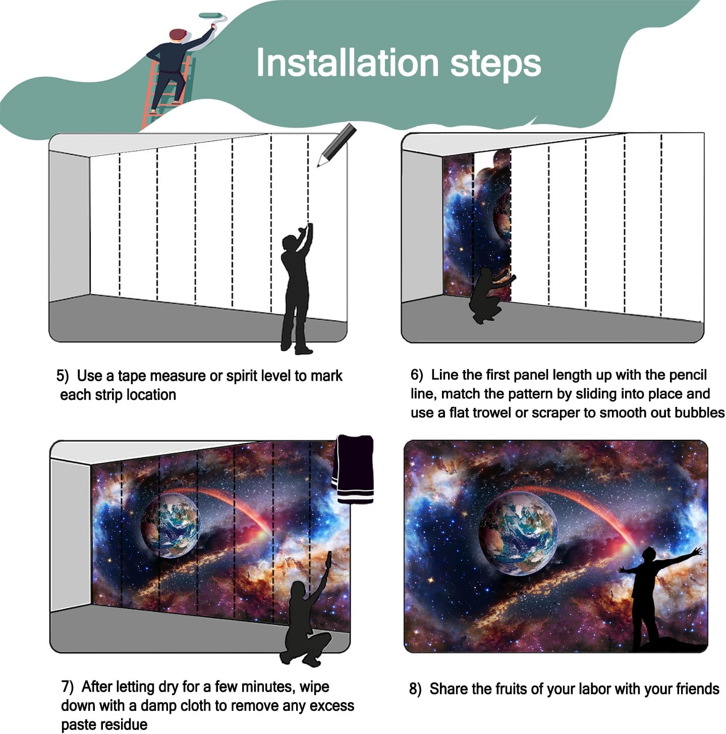 - Mural wallpaper size: 180 "W x 115 "H, divided into 9 sections, each section is labeled with a number underneath, there is no need to overlap the pattern when installing, just install according to the number labeled underneath the panel