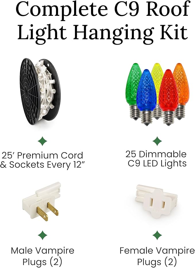 - CUSTOM DIY HOLIDAY LIGHTING KIT – Elevate your Christmas and holiday lighting to the next level with professional grade C9 LED Christmas lights custom installation kit. Light like the pros by using the same type of light line, bulbs, and vampire plugs that professional Christmas installers use. The 18 gauge, SPT-1 C9 light line can be cut to any length and the included vampire plugs can be easily attached to provide power. No hard wiring or electrical experience needed.
