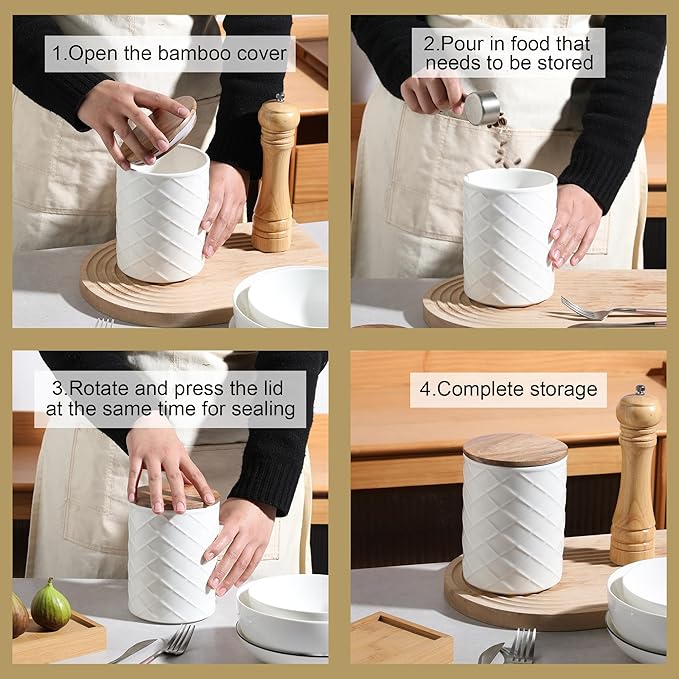 - EASY TO CLEAN - The ceramic storage container is round and smooth, easy to clean. Canisters are dishwasher safe. BUT Lids are hand wash only.