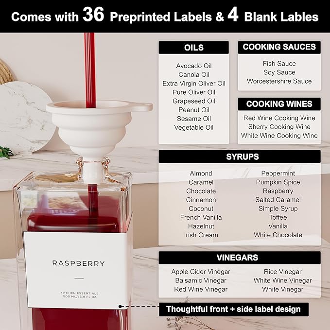 - 40 Oil-free Labels: Each set of oil dispenser has 36 white printed labels and 4 white blank labels, waterproof, oil and stain resistant, reusable for many times, no residue left after peeling off, thoughtful front + side labeling design allows you to easily distinguish seasonings, help you find the right seasoning in your busy cooking process, able to meet most of your daily needs.