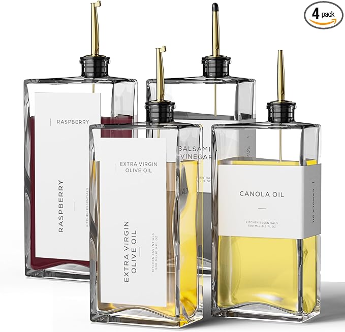 - Modern Kitchen Essential: Elegant and minimalist olive oil dispenser bottle include 4 high-quality 16.9 oz (500 ml) glass bottles, 4 weighted self-closing spouts, 4 Silicone Dust-Proof Oil Spouts, 1 funnel and a set of 40 labels, making them a must-have for any kitchen. Practical and decorative for your kitchen counter, these cooking oil dispenser meet all your kitchen needs for style and functionality!