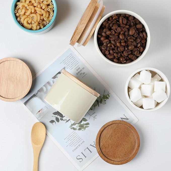 Sweejar Kitchen Canisters Ceramic Food Storage Jar, Stackable Containers with Airtight Seal Wooden Lid for Serving Ground Coffee, Tea, Sugar, Spice and More - 5 Fl Oz(White Acacia)