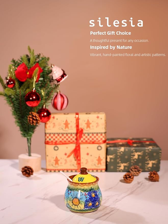 silesia Handmade Sugar Bowl with Lid and Spoon, 9 Ounce Ceramic Hand-Painted Sugar Jar for Home in Gift Box, Kitchen Decor, Oven, Dishwasher & Microwave Safe, Glazed Yellow