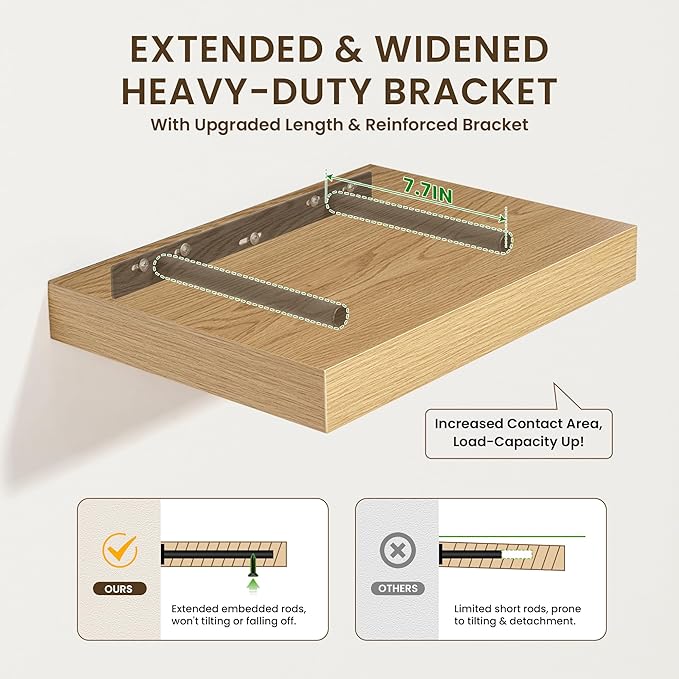 - UPGRADED MOUNTING SYSTEM-The extended supporting bars on the metal brackets ensure our wall shelves remain sturdy, preventing any wobbling or sagging. Plus, the included plastic plugs guarantee the shelves to stay firmly in place