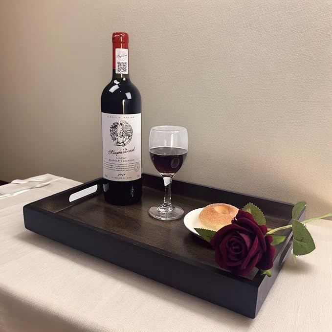 - Our rectangular wooden serving tray is made of natural and hard bamboo and wood, with a smooth surface and a mortise and tenon structure that is not easily broken or scattered. The appearance is simple, beautiful and generous. The unique black walnut color enhances its aesthetic appeal. But it's made of bamboo and wood.