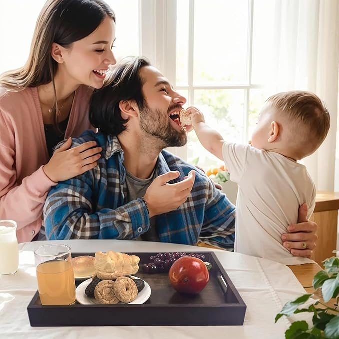 - Our bamboo tray is made of solid wood. Although it is made of bamboo, we give it black walnut color and texture to make it look different from other tray. It is very suitable for breakfast, lunch, dinner, bread, vegetables, bread, fruits, appetizers, desserts. It is also the best choice to serve food to friends at parties and bars. By using them, you will receive a lot of praise!