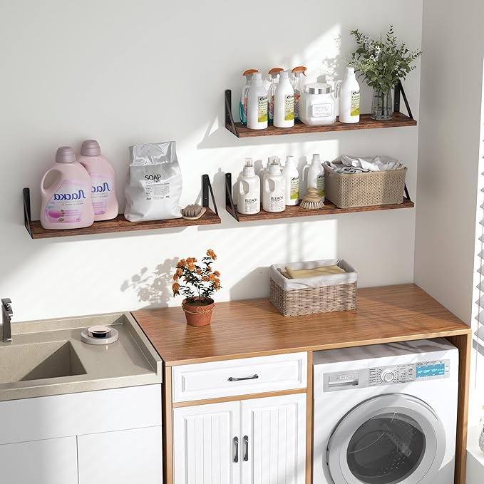 Heimlove Floating Shelves for Wall, 24 Inch Long Wood Floating Shelves Set of 3, Wall Mounted Hanging Shelf for Bathroom Bedroom Kitchen, Rustic Brown