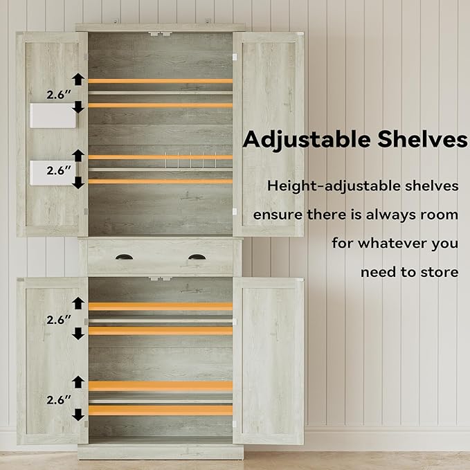 - Easy to Assemble: The instruction is very detailed and easy to read, and even inexperienced people can quickly complete the installation. Pantry cabinet in one box, no worry about waiting for the second box