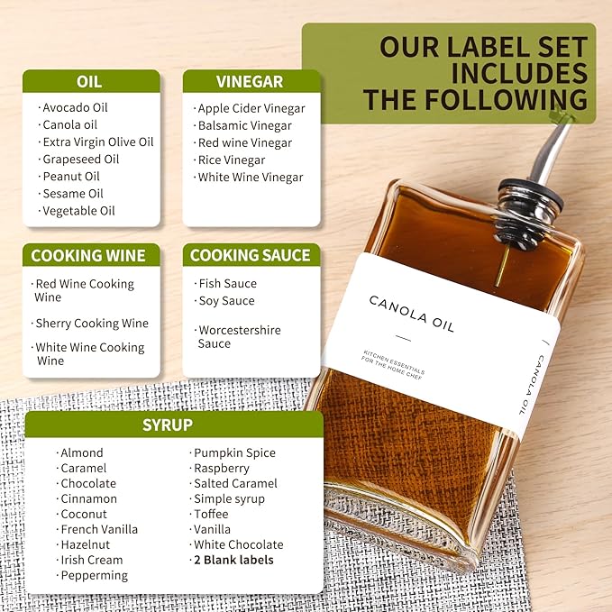 - 【Modern Kitchen Essential】 Minimalism Inspired Cooking Oil Dispenser for Kitchen. This Set Includes Three High-quality 12 Oz (350 Ml) Glass kitchen Oil Dispensers, three spouts, a funnel, a make-pen and a 32 Label Set.