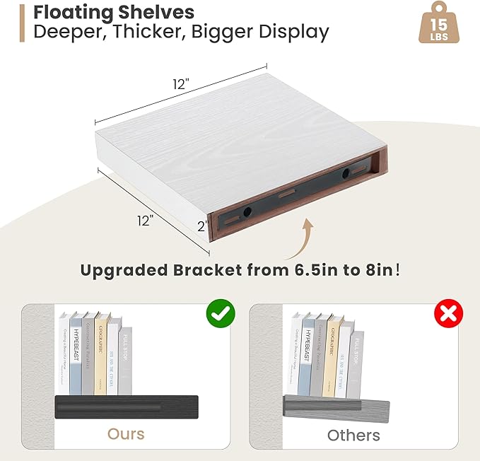 Heimlove 12 Inch Deep Floating Shelves, 12 x 12 inches Long Wall Shelf, Large Extra Display Shelf & Storage Shelf, Rustic Wood Wall Shelves for Fireplace Mantel, White - 2Pack