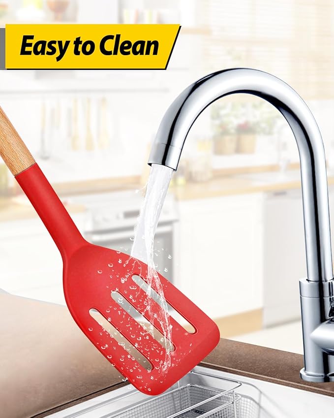 Pack of 2 Silicone Cooking Spatula, Heat Resistant Solid Turner, Non Stick Slotted Spatulas with Wooden Handle,Ideal Wood Kitchen Utensils Set for Frying, Baking, Flipping, Turning (RED)