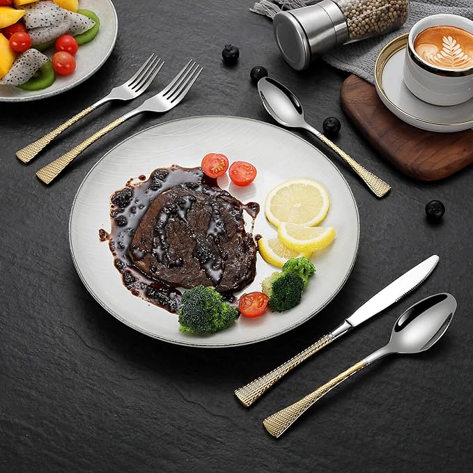 Hammered Silver Gold Silverware Set for 8,Stainless Steel 40-Piece Modern Cutlery Set,Mirror Polished Heavy Duty Flatware Set Utensil Set,Knives Spoons and Forks Set,Dishwasher Safe