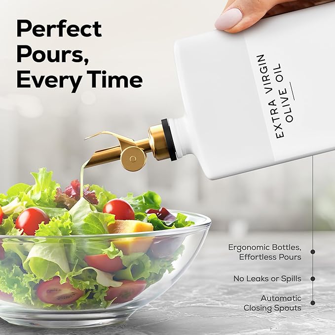 - PERFECT POURS EVERY TIME – Crafted with high-grade 304 stainless steel and automatic closing spouts, our olive oil dispenser set, which also works perfectly for coffee syrups, avocado oil, soy sauce, canola oil, and vanilla syrup, ensures a drip-free, leak-proof experience. Rest easy that you will enjoy a smooth precise pours every time.