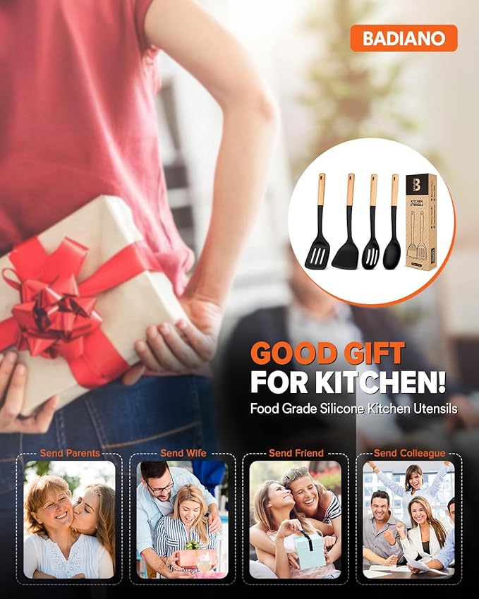Silicone Cooking Utensils Set, Perfectly Angled for Frying, Mixing,Serving,Draining,Turning and Stirring, BPA-Free Matte Silicone, Wood Handles, Safe for Nonstick Cooking Surfaces,4 Pack (Black)