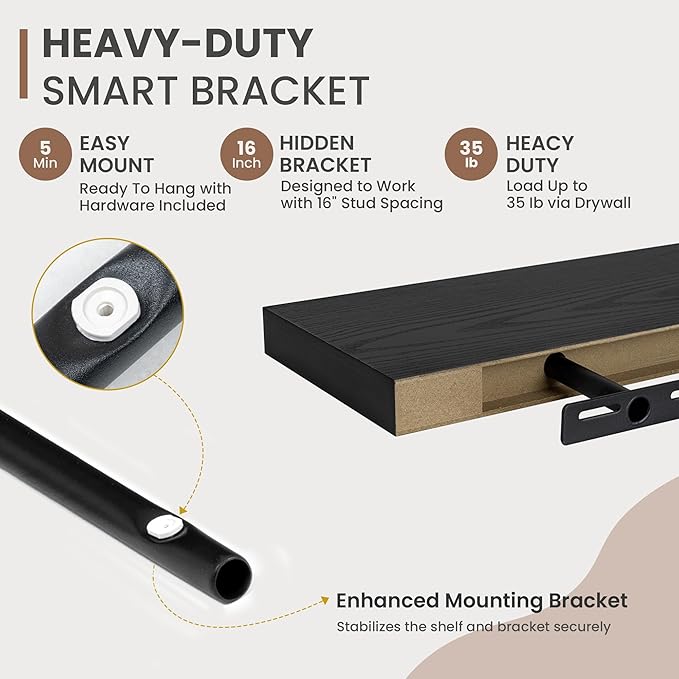 - [EASY INSTALLATION WITH FULL INSTRUCTIONS]: Our floating shelves come with all mounting hardware and an easy-to-follow guide, allowing for quick setup in less than 10 minutes. With step-by-step instructions, you can enjoy these beautiful shelves with minimal effort, adding an instant upgrade to your space.