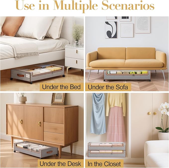 - 【Clear Lid Design&Dustproof Double Zipper】Under bed storage containers feature a clear lid design and dustproof double zipper. The clear lid and labeled design lets you see what's inside at a glance—no need to open the box or dig through your items. Plus, the airtight double-zipper seal locks out moisture, grease, and dust, keeping your belongings clean, organized, and clutter-free