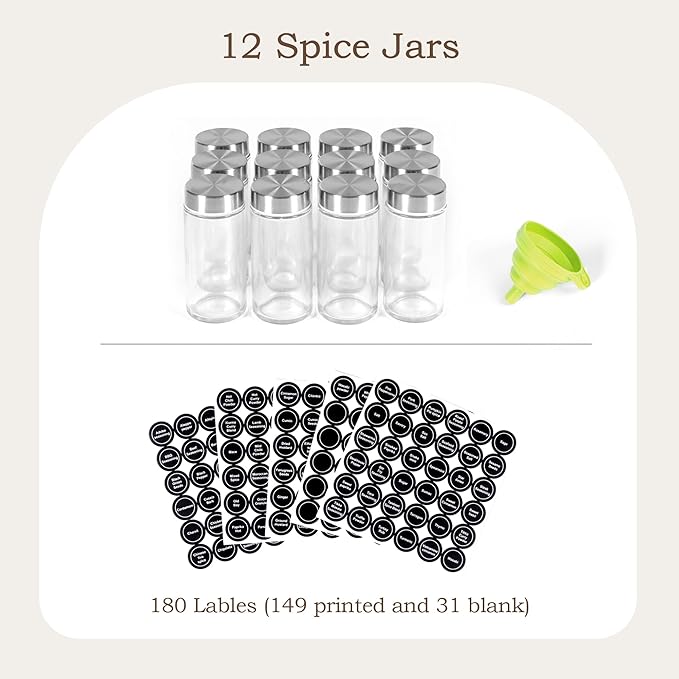 - 【All-Inclusive Set】Includes 12 airtight glass jars, funnel, 180 lables(149 printed and 31 blank), functional kitchen spice organizer.