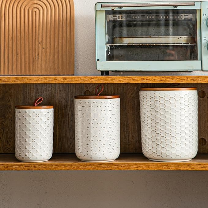 - Easy Access with Wide Mouth Design - Each white ceramic canister features a wide-mouth opening, making it easy to fill and scoop ingredients. Whether you're baking or prepping, your ingredients are always within easy reach.