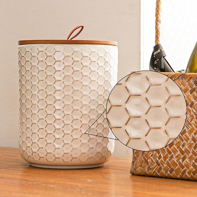 - Airtight Seal with Embossed Elegance - Made from durable white ceramic with embossed surfaces and bamboo lids, each jar includes a silicone ring that helps seal in freshness while keeping out air and moisture—preserving both taste and texture.