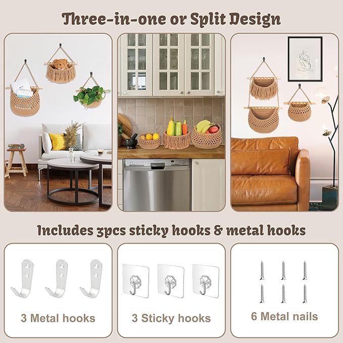 - Handwoven Natural Look: Expertly handwoven from eco-friendly cotton rope, these wall hanging baskets add natural charm and texture to any space. The natural color complements modern, rustic, or farmhouse interiors with ease.
