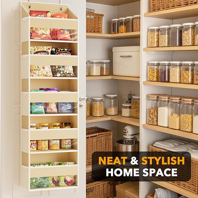 - ORGANIZED AND BEAUTIFUL - Make your behind the door space neat and organized with this beige over the door storage and organizer with 5 clear pockets and 10 mesh side pockets; Product Size: 15.2"W x 6.6"D x 55"H