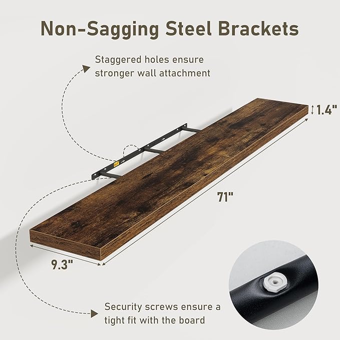 Fun Memories 72 Inch Floating Shelves for Wall 2 Pack Shelves for Bedroom|Kitchen|Bathroom 72 x 9.3 Inch Wood Floating Shelf with Invisible Brackets for Books|Storage|Decor, Rustic Brown