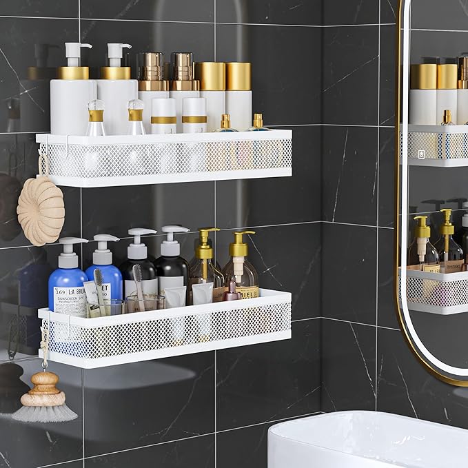 - 【MULTI-PURPOSE&MULTIFUNCTIONAL】5 Hanging Storage Baskets Organizer Set for Sufficient Bathroom Kitchen Storage Space, The bathroom&Kitchen organizer comes with 5 pieces for different uses, including 2 Hanging Storage Baskets, 1 soap holder,1 Tissue holder ,1 utensil holder and 2 adhesives. The perfect solution for organizing a multitude of every items indoor or outdoor. The cabinet organizer hanging baskets wall mount is Ideal for organizing and storing spice bottles, pantry items, snacks, toiletries, tools, craft supplies,etc. And this metal bin basket free up enough space for your homes, kitchen, living room, bathroom, camper, farmhouse, apartments, college dorm rooms, etc.