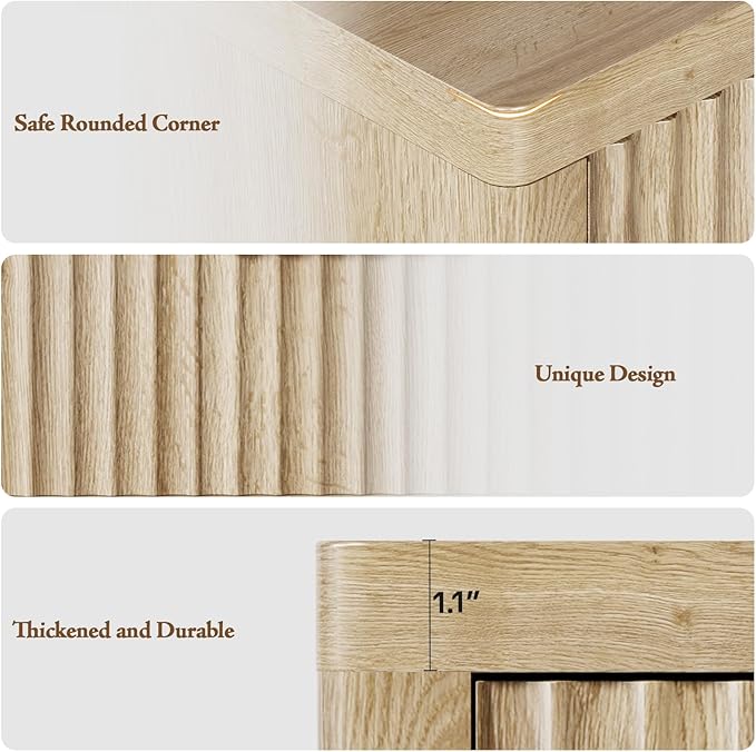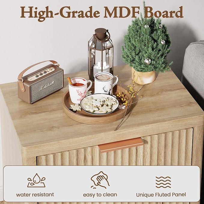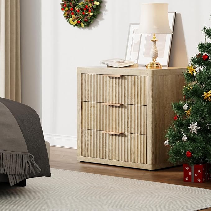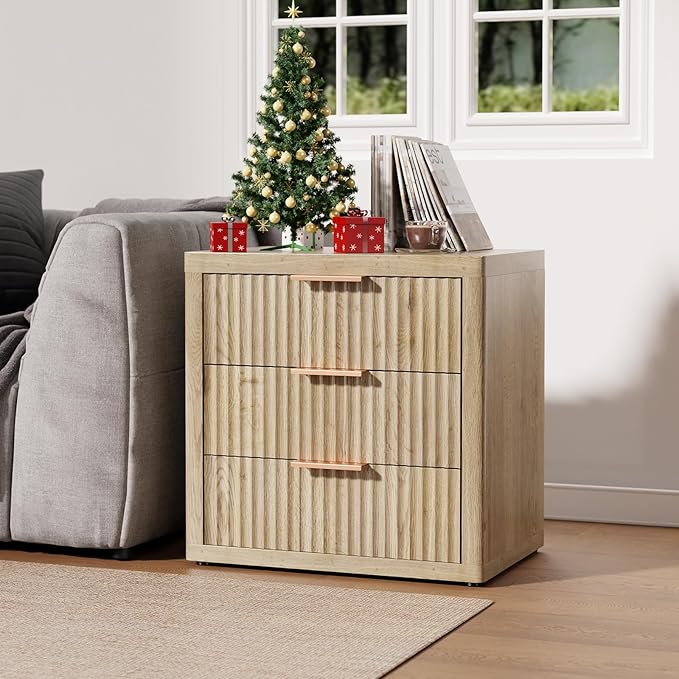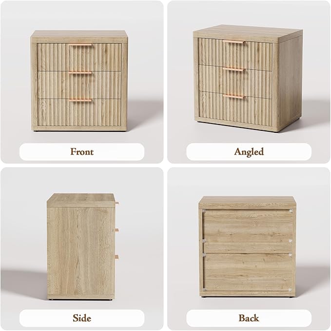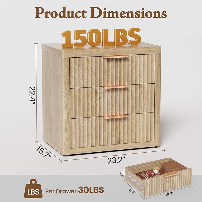 Night Stand with 3 Drawers, 23" Wide Modern Bedside Table with Large Storage, Fluted Bed Side End Table with Metal Handle, Tall Nightstand for Bedroom, Living Room, Office, Nature, Set of 2