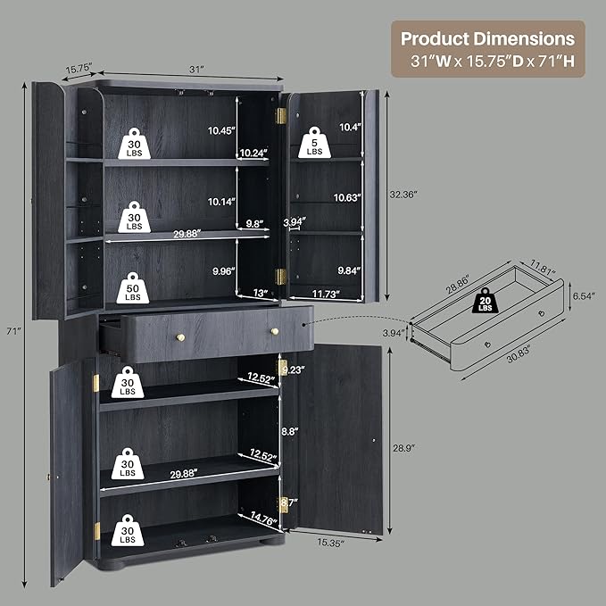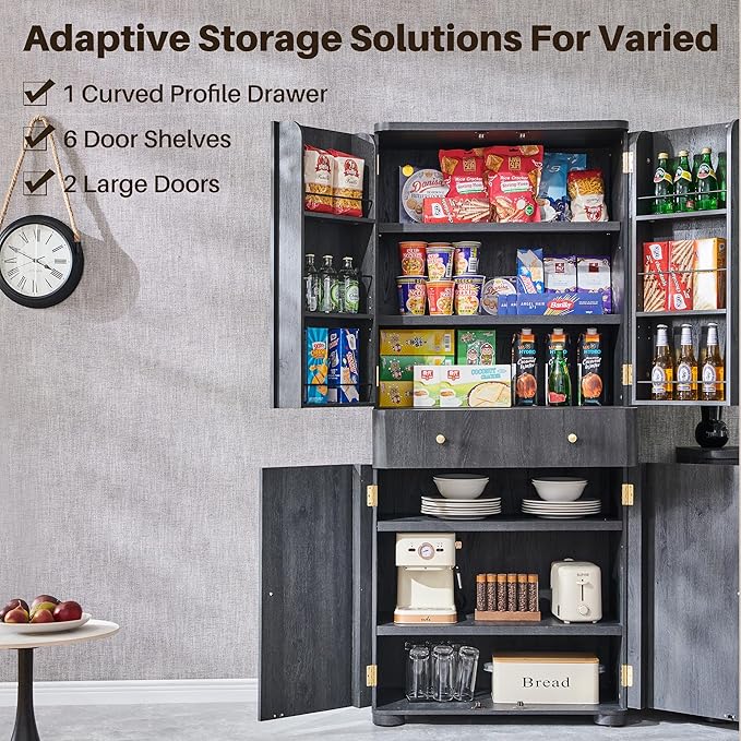 - Massive Storage Capacity & Flexible Organization: This 71" tall pantry cabinet offers immense storage with 1 curved profile drawer, 2 large doors, 6 door shelves perfect for single-serve items, and an adjustable middle shelf (3 height options). Conquer kitchen clutter effortlessly.