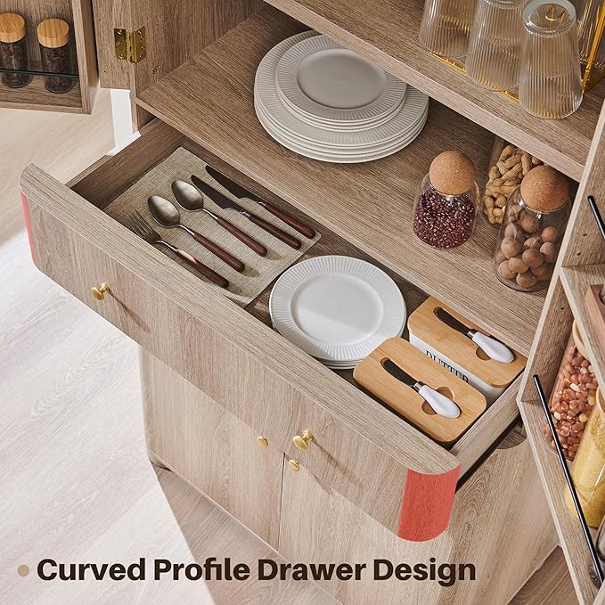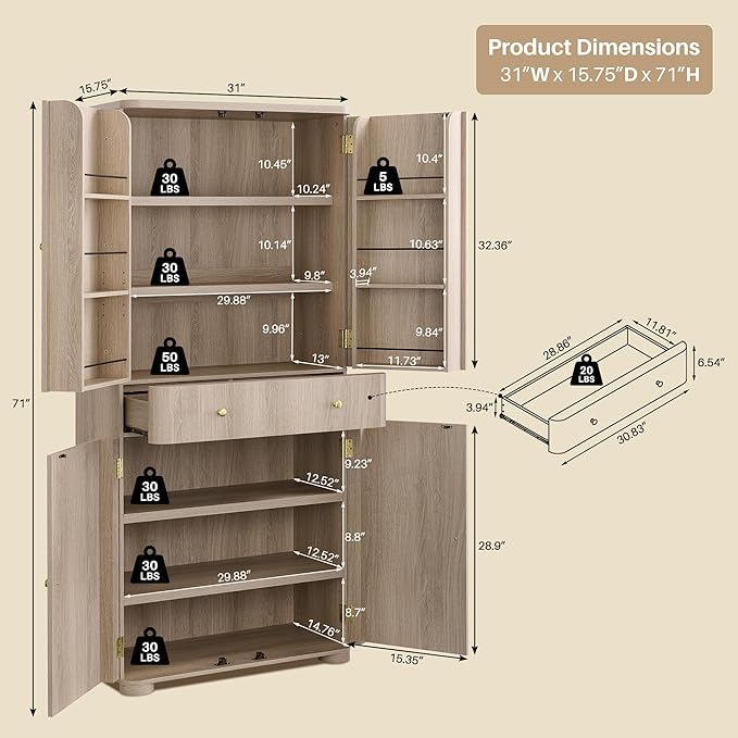 - Massive Storage Capacity & Flexible Organization: This 71" tall pantry cabinet offers immense storage with 1 curved profile drawer, 2 large doors, 6 door shelves perfect for single-serve items, and an adjustable middle shelf (3 height options). Conquer kitchen clutter effortlessly.