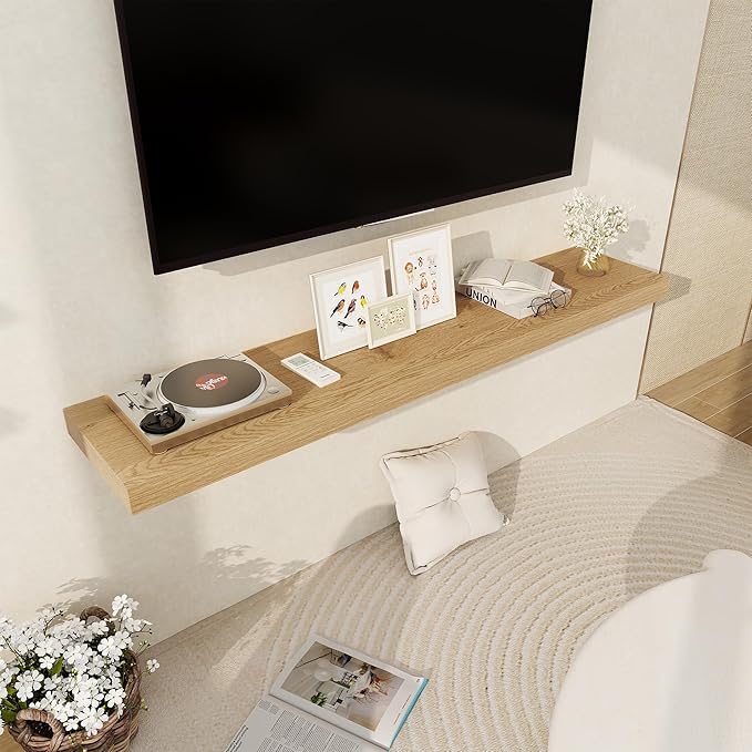 - 【12 INCH DEEP FLOATING SHELF】This extra deeper and thicker wall shelves are 12 inches in depth and 2 inches in thickness instead of the regular narrow floating shelves, you can put photos, pictures, DVD players, videos, books, toys, and some other knickknack on this beautiful display wooden shelf.