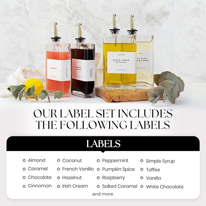 - Customizable, Organized, Practical - Waterproof labels, tighter caps, and a wide-mouth design make this vinegar and oil dispenser set easy to label, refill, and clean. A thoughtful oil dispenser bottle built for daily use.