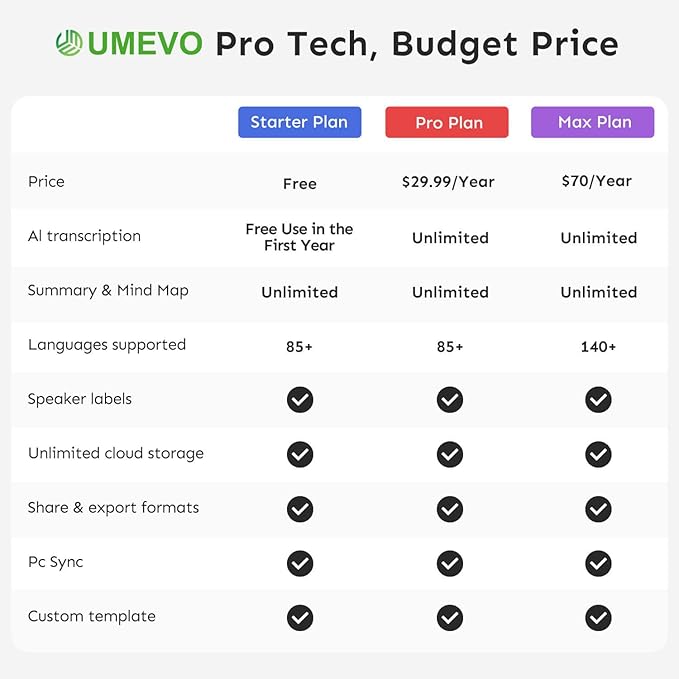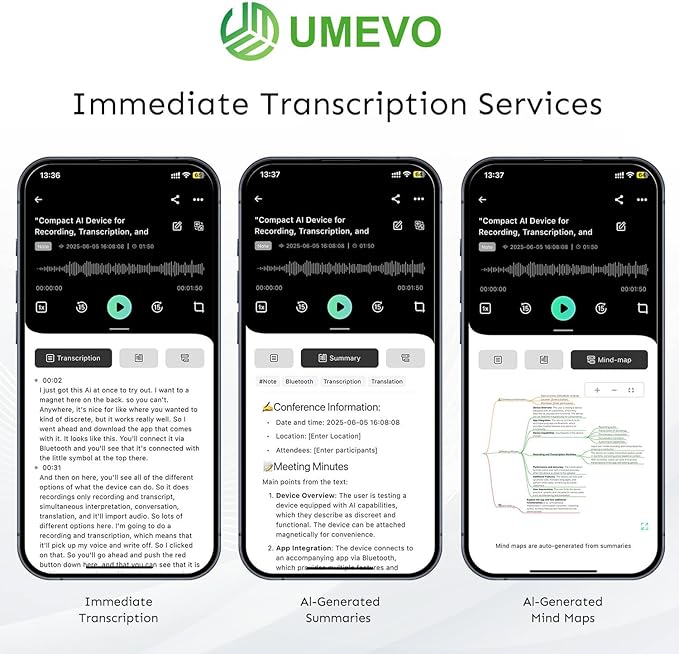 - Unlimited AI Transcribe Note Voice Recorder: Powered by the latest GPT-4.1 model, the UMEVO voice recorder integrates recording, AI transcription, summarization, mind mapping, and translation across 140 languages. It supports up to 30 hours of recording and 64GB of storage. UME UMEVO is your ultimate AI personal assistant for meetings, interviews, and calls. Free unlimited transcription for the first year