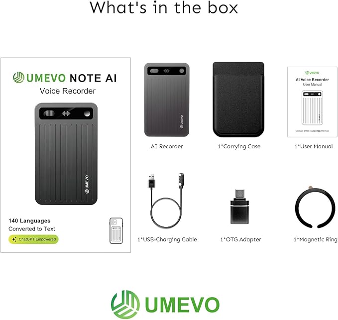 - Ideal Chrimas Gift :The Package Includes are 1 AI voice recorder(Black), 1 black carrying case, 1 magnetic ring, 1 USB-Charging cable, and 1 OTG adapter. Note: Upon activating UME UMEVO smarter ai note taking, you will receive a complimentary starter plan. First year support for unlimited transcription. For additional transcription time, subscribe to a professional plan or purchase extra minutes. Translating and generating summaries within the “AI DVR Link” app may take several minutes, please be patient